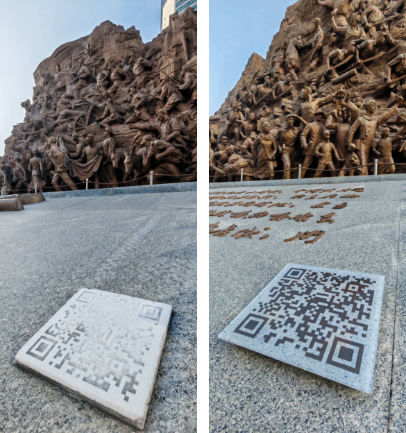 網友留言附圖。左圖為雕塑北側二維碼﹔右圖為雕塑南側二維碼。