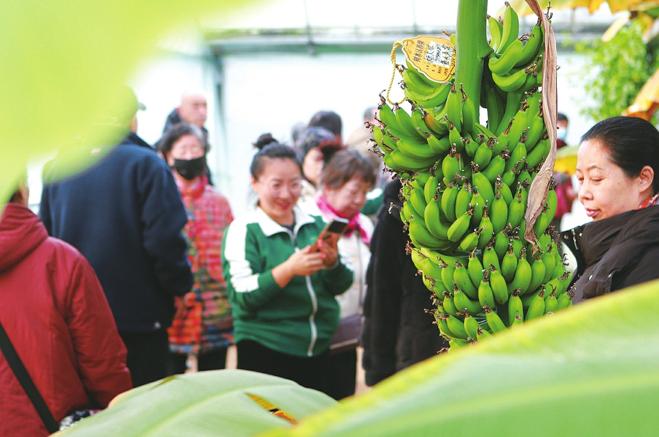 2025年12月24日,忻州市忻府區光子農業合作社蔬菜大棚示范園區內,游客正在觀賞熱帶植物。該園區引進種植香蕉等熱帶植物,形成了集觀光農業、農耕體驗、教學科研為一體的多功能現代化農業園區,解鎖冬季觀光旅游消費新場景。(李春澤攝)