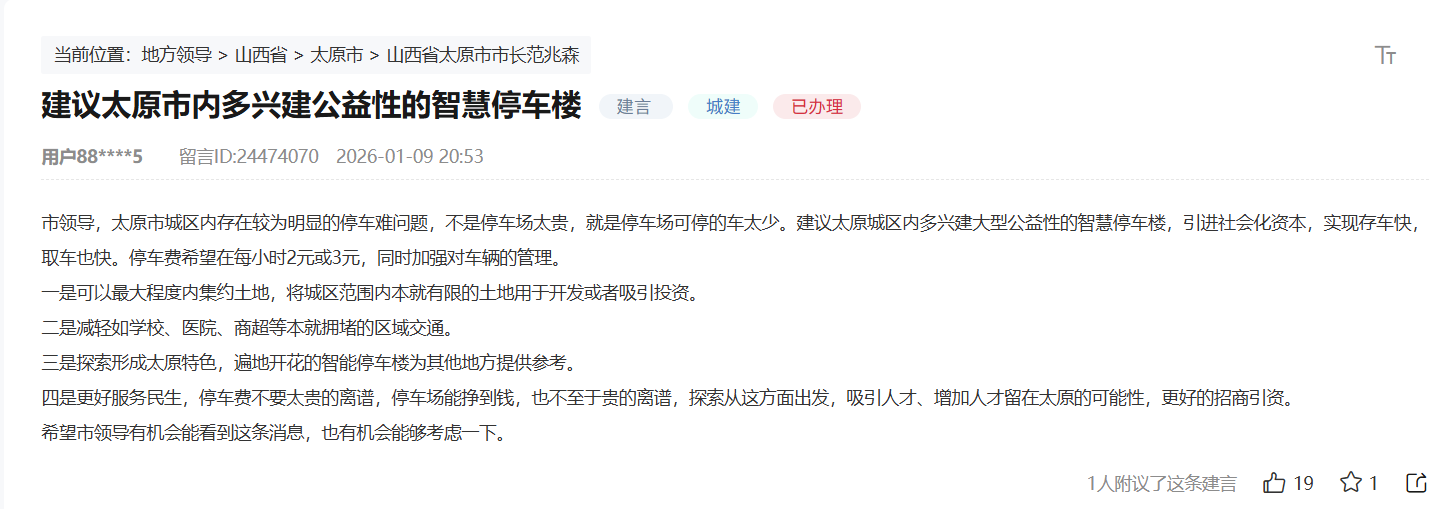 陳先生詳細列出了如此建議的理由,包括有助於集約利用城區有限的土地,能緩解學校、醫院、商超周邊的道路擁堵等。他還提出,希望探索形成可推廣的“太原特色”智能停車模式,通過合理收費服務民生,提升城市吸引力,助力人才引進與招商引資。