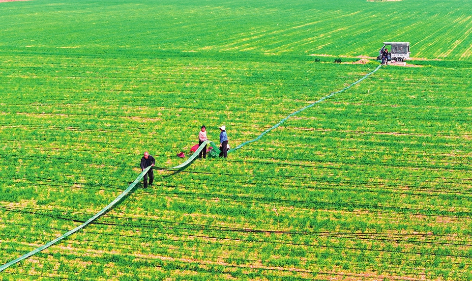 3月29日,稷山星晟現代農業示范園工作人員在麥田鋪設滴灌帶。栗盧建攝
