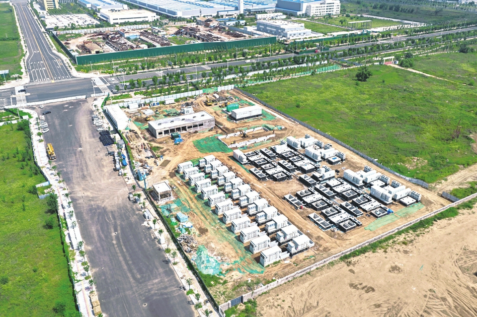 10月3日,山西转型综改示范区,俯瞰太原智储100MW独立储能电站项目建设工地。该项目采用领先储能技术,建成后将增强电网调峰能力,提升电网安全性,推动能源结构低碳转型。(记者 王瑞瑞摄)