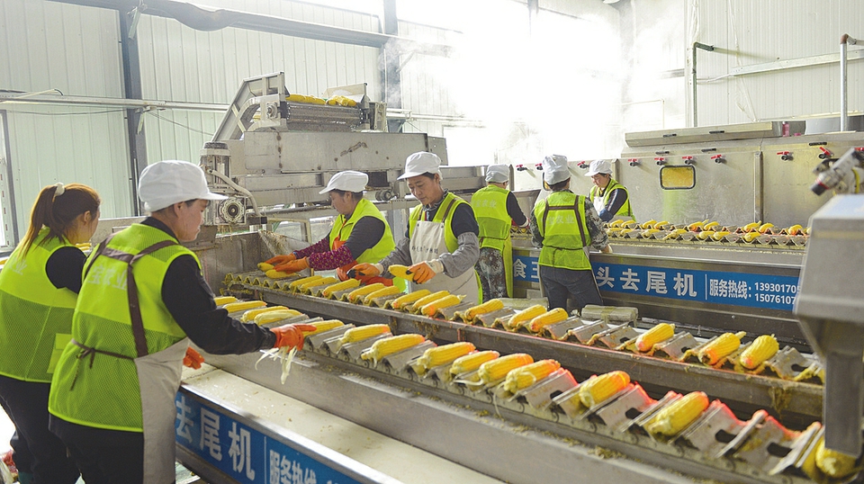 10月5日,山西晋宝农产品开发有限公司玉米自动化流水生产线上,工人们正在有序操作,保障节日市场供应。(杨应平 摄)