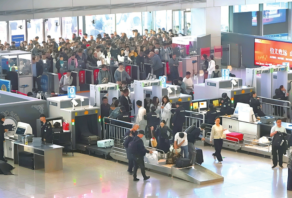 10月4日,太原南站,旅客正有序通过安检。站内工作人员各司其职,以贴心服务为乘客创造安全有序的环境。(记者 申晋光摄)
