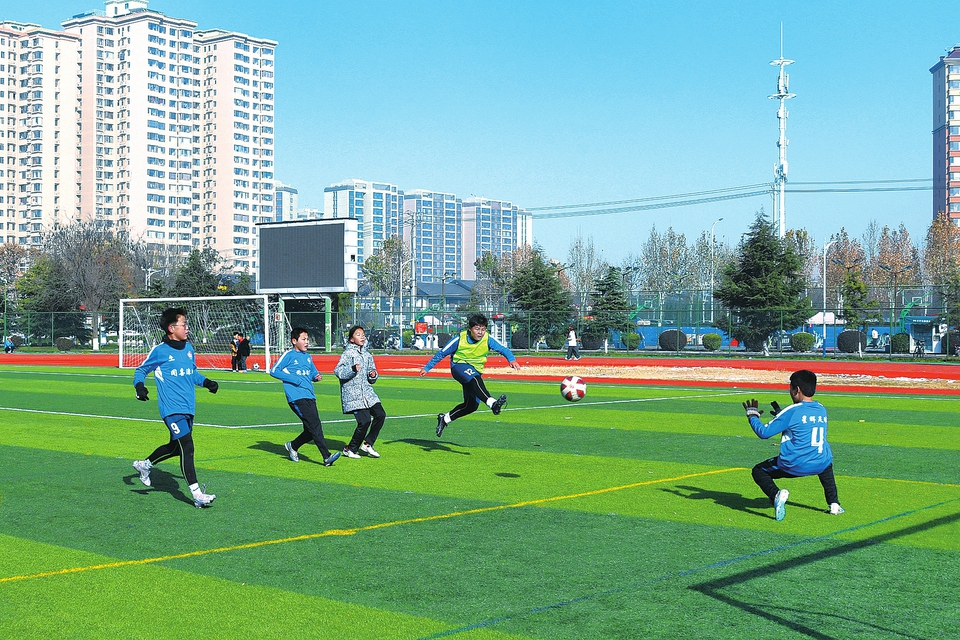 12月15日,闻喜体育公园足球场上,学生正在冬训。入冬以来,闻喜县通过讲足球、赛足球等多样形式,普及足球知识与技能,提升校园足球发展水平与学生综合素质。(温徐旺摄)