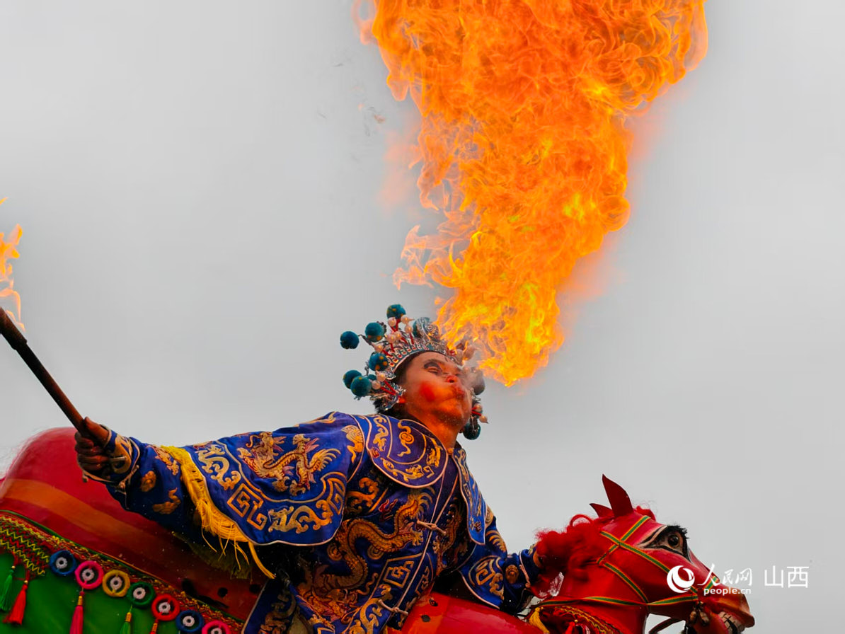 竹马高跷演员表演喷火绝活。