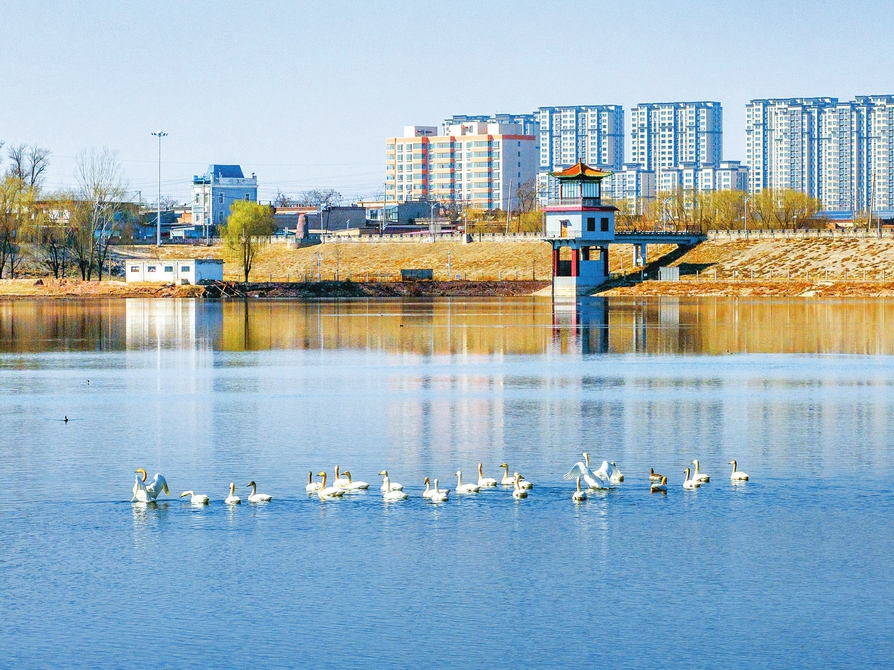 3月11日,平遥县惠济省级湿地公园,白天鹅自在游弋。近年来,当地持续加大对该公园内湿地资源的保护与修复力度,维护生态功能和生物多样性,使公园成为鸟类栖息的乐园。(梁生仁摄)